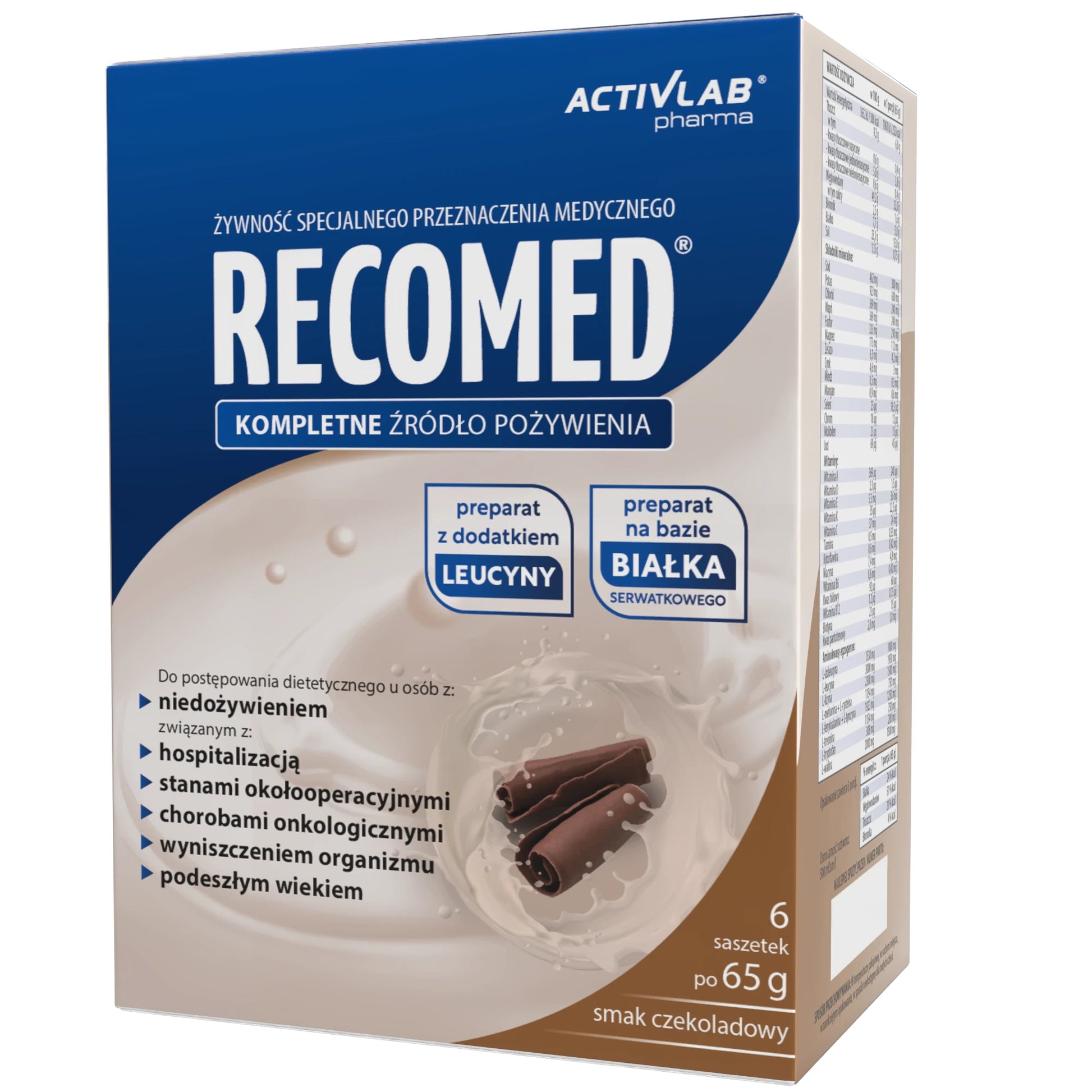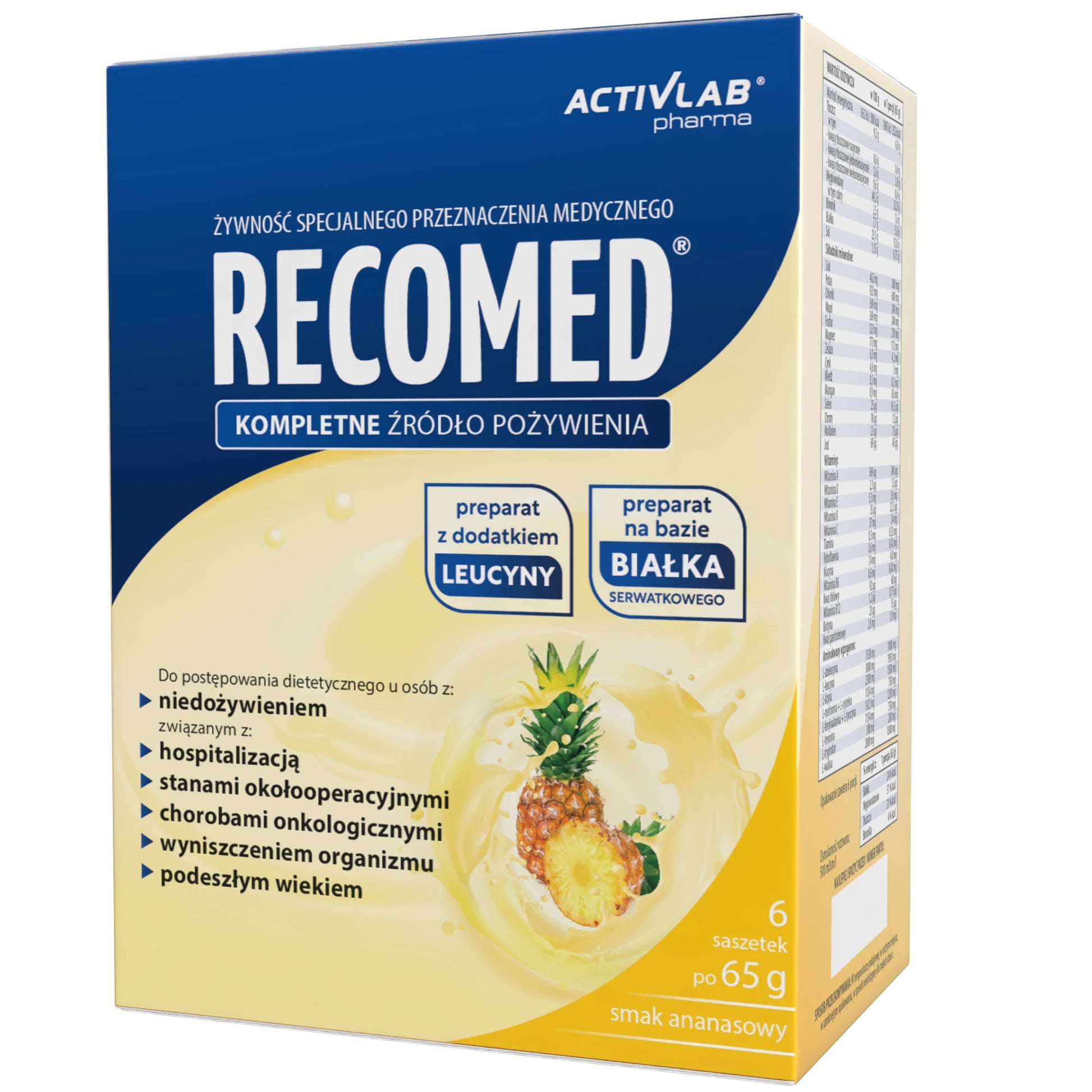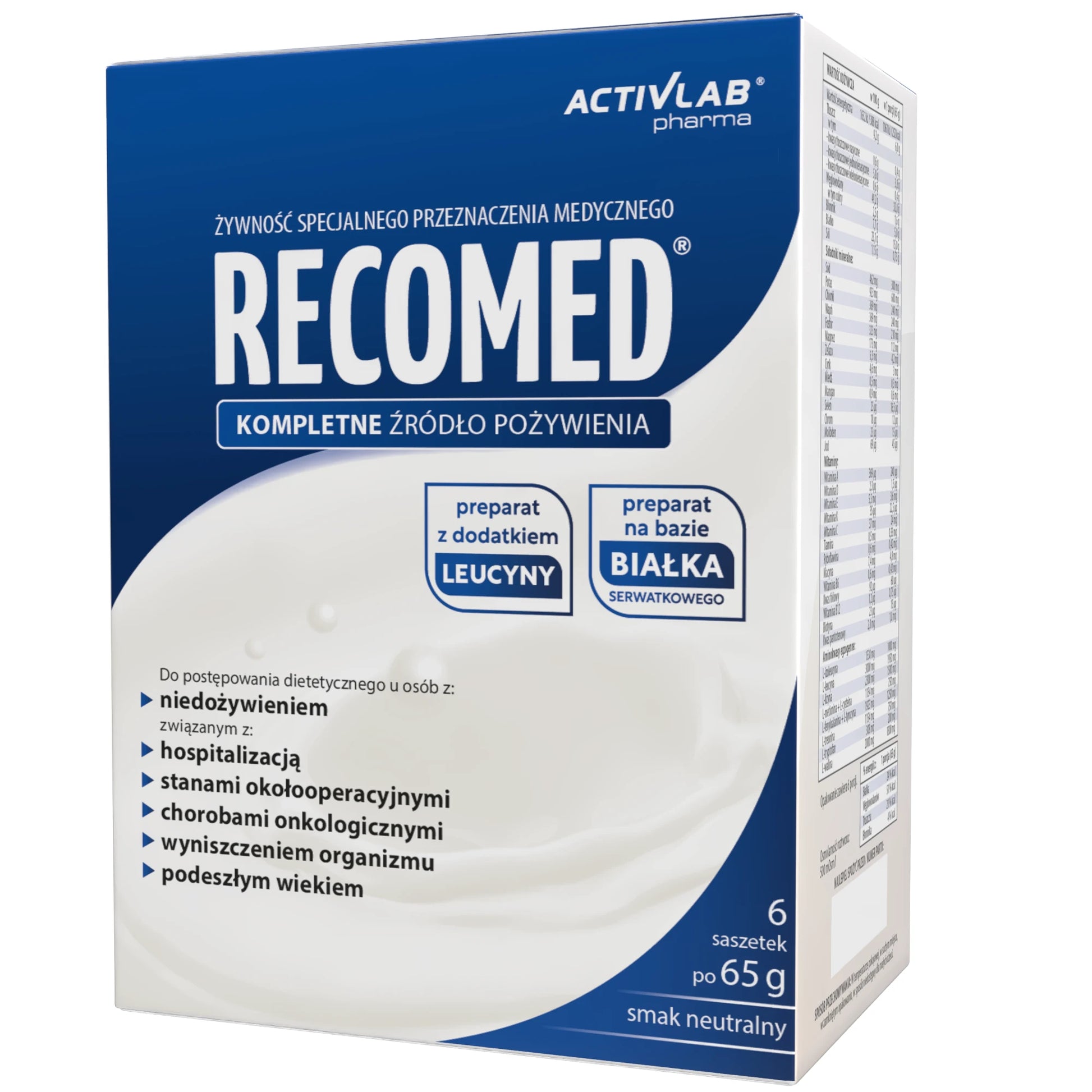 Харчовий продукт для спеціальних медичних цілей. Повноцінне джерело їжі, склад якого задовольняє харчові потреби людей, які одужують після хвороби або операції, а також тих, хто страждає на недоїдання або ослаблення. RecoMed містить усі необхідні поживні речовини: білки, вуглеводи, жири, харчові волокна та повний набір вітамінів і мінералів. Концентрована форма продукту полегшує введення та не створює додаткового навантаження на організм пацієнта. Білок, що міститься в продукті, являє собою концентрат сироваткового білка (WPC) найвищої якості з біологічною цінністю 104. Амінокислотний склад білка також був оптимізований шляхом додавання амінокислот у пропорціях, необхідних для підвищення харчової цінності білка – досягнення оптимальних пропорцій незамінних амінокислот (EAA), рекомендованих для щоденного споживання Всесвітньою організацією охорони здоров'я (ВООЗ).