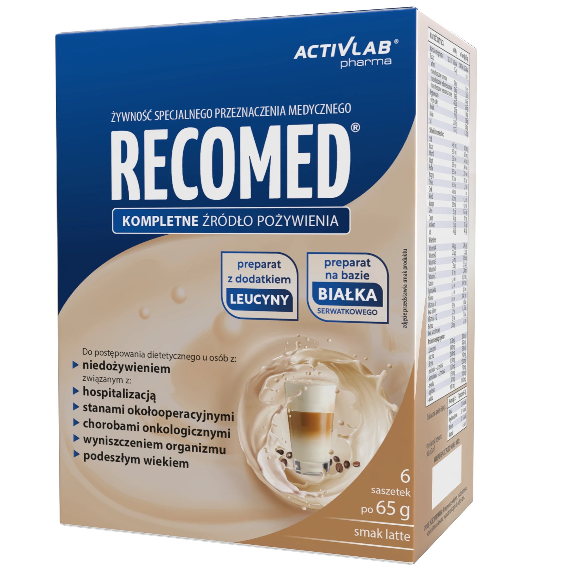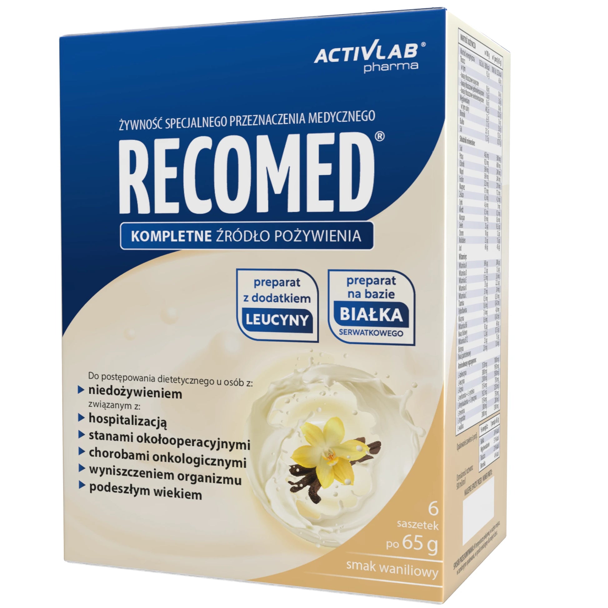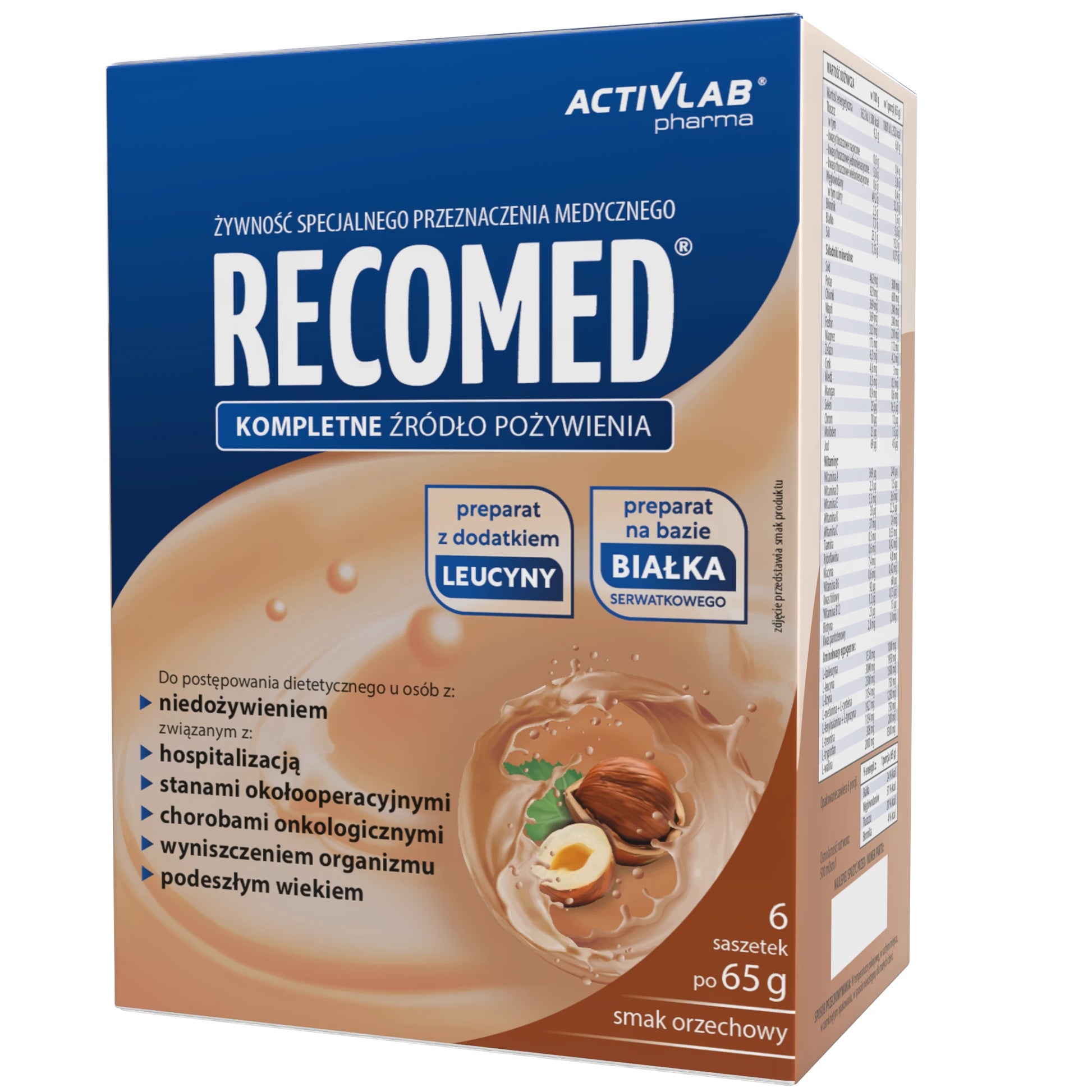 Харчовий продукт для спеціальних медичних цілей. Повноцінне джерело їжі, склад якого задовольняє харчові потреби людей, які одужують після хвороби або операції, а також тих, хто страждає на недоїдання або ослаблення. RecoMed містить усі необхідні поживні речовини: білки, вуглеводи, жири, харчові волокна та повний набір вітамінів і мінералів. Концентрована форма продукту полегшує введення та не створює додаткового навантаження на організм пацієнта. Білок, що міститься в продукті, являє собою концентрат сироваткового білка (WPC) найвищої якості з біологічною цінністю 104. Амінокислотний склад білка також був оптимізований шляхом додавання амінокислот у пропорціях, необхідних для підвищення харчової цінності білка – досягнення оптимальних пропорцій незамінних амінокислот (EAA), рекомендованих для щоденного споживання Всесвітньою організацією охорони здоров'я (ВООЗ).